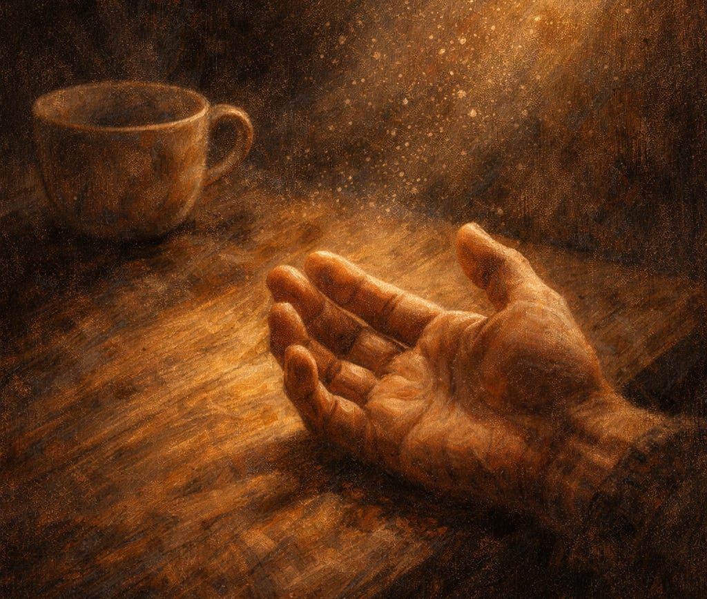 الكوب على الطاولة — نفس الكوب، نفس المكان — لكن الضوء يسقط عليه بزاوية تجعله يشبه شيئًا من ذاكرة لم تحدث بعد. الماء فيه ساكن، سكونًا يشبه الإصغاء.