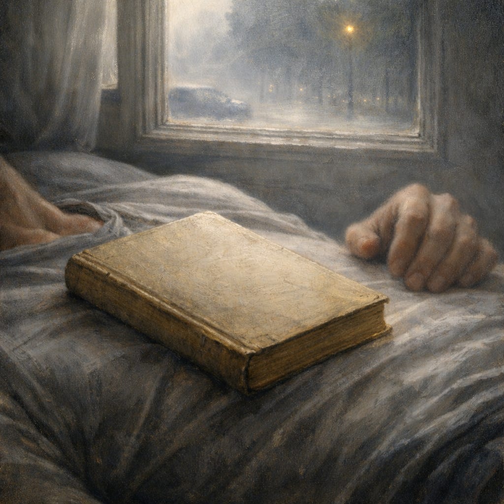والكتاب على صدري ترك أثراً خفيفاً. ليس خدشاً، بل دفئاً. دفء من النوع الذي يتركه شيء كان هنا ثم رُفع. أمرّر يدي على المكان. لا شيء. لكن الجلد يتذكّر.