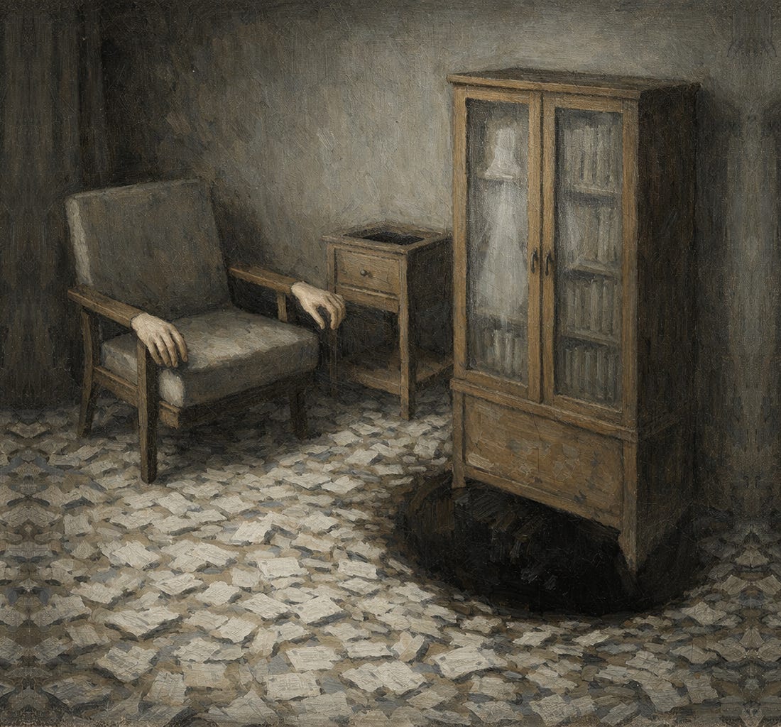 وفي الدرج، ما زال الرقم يتنفّس — لكن بإيقاعٍ أبطأ، كرئة حيوانٍ نائمٍ لن يستيقظ. الحفرة حوله اتسعت. ابتلعت الدرج. ثم ابتلعت المنضدة. ذات ليلة سمع صوت خشبٍ ينطحن من غرفة المعيشة — حين دخل وجد زاويةً من الخزانة قد اختفت في الأرض. لم يبقَ من هناء إلا ثلاثة أرفف وصوتٌ يردّد رقمًا واحدًا بلا توقّف.
